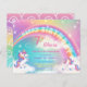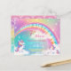 Um Convite de aniversário Magical Rainbow Unicorn Kid Children. Num fundo de céu multicolor, o Parabéns é escrito dentro de um arco-íris e cercado por nuvens, estrelas e unicórnios fofos. Personalize adicionando seu evento de cheio e os detalhes de contato.