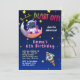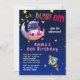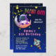 O Convite de aniversário Moon Adventure (garota) apresenta texto dizendo, 3,2,1— Explosão! Tem um astronauta personalizável posando com uma lua crescente. Em seguida, há um lugar para colocar o nome da criança. Uma nave de foguete se acelera no fundo. Tudo contra um céu estrelado. O verso do convite tem muitas ilustrações espaciais legal.