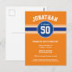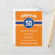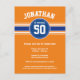 Listras azuis reais e um fundo laranja destacam este convite de festa de aniversário temático esportivo. O design inclui um design de camiseta esportiva com uma área para destacar o nome e a idade do aniversariante.