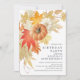 Belo convite de festa de aniversário de outono com folhas e abóboras em aquarela e um fundo de madeira coordenado.
