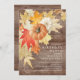 Belo convite de festa de aniversário de outono com folhas e abóboras em aquarela e uma parte de trás de madeira coordenada.