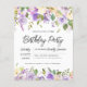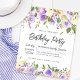 Honra uma mulher especial com este convite de aniversário elegante e feminino. Os detalhes da comemoração de aniversário estão cercados por cima e por baixo, bordas florais roxas. Os elementos florais estão aninhados em folhas verdes profundas. Enquanto é um design tradicional, a folhagem botânica aberta e arejada e o texto lhe dão uma vibração contemporânea. Este item faz parte da coleção Botânica Floral Roxo Rústica.