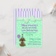 O convite de aniversário de uma garota branca feito em verde roxo, branco e menta. Minhas bolinhas brancas e um cachorro giro em um chapéu de festa e segurando um balão em sua boca, decoram a área de texto desse convite colorido. O cabeçalho é feito em listras roxas, brancas e de menta finalizadas com uma fita e um arco bonito. Personalize este convite para a festa de excelente para o aniversário do seu filho.