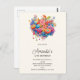 Cartaz de convite de aniversário com uma coleção colorida de flores de primavera e verão. Cor de laranja rosa e azul dominam o esquema de cores. Um arranjo floral brilhante e ousado exude felicidade. :)