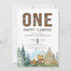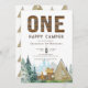 Este divertido convite rústico tem uma madeira chamada "ONE" e um campista feliz. O fundo tem uma floresta aquosa, montanhas e paisagem. É finalizado pelos elementos de acampamento bronzeado, verde e castanho, que incluem uma tenda e uma lareira. O dorso tem um padrão da mesma tenda de aquarela.