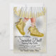 Convite de festa de tênis para menina com tênis dourados glams e vestido em um fundo prateado e dourado. Este convite de festa de tênis é facilmente personalizado para o seu evento, basta adicionar seus detalhes.