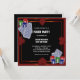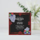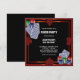 Convite de aniversário de festa de pôquer vermelho e preto com cartas, fichas de pôquer e naipes.