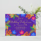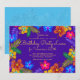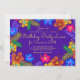 Convite de aniversário roxo para uma data especial. Arte colorida de hibiscos tropicais cerca o texto central que é amarelo brilhante sobre roxo escuro. O verso é de uma cor azul tropical bonita e também tem uma estampa floral.