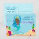 Junte-se a nós debaixo do mar para uma festa de aniversário infantil caprichosa para uma menina afro-americana que ama sereias de cabelo roxo. Esses convites de festa em forma de cartão postal apresentam uma adorável sereia negra de cabelo azul nadando em torno do lindo coral oceânico. Um tema de festa na piscina infantil legal com água azul profunda.