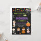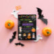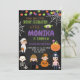 Festa de Figurino de Halloween Convite de Aniversário Convidado para celebrar seu aniversário de Halloween. Convide pessoas para a sua festa com este design incrível. Gato bonito saindo da abóbora com faixa de halloween, luas e morcegos é uma combinação tão excelente para o aniversário das crianças!