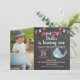 Foto de Aniversário do Quadro de Chalkboards de Boca-branca Convite de Aniversário Este convite de aniversário de quadro de criança fofo apresenta uma baleia, algumas bandeiras de bunting, um cabeçalho de duas cores e pontos de ouro esmaecidos num fundo de quadro de chalkboard. Esta é uma maneira fofa de convidar convidados para a festa de aniversário temática da baleia do seu filho.