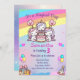 Adorável convite de aniversário de unicórnio mágico. Arco-íris brilha fundo com unicórnios atuais e bolo de aniversário.