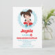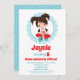 O convite para o aniversário desta rapariga apresenta uma linda menina noturna de cinema com uma caixa de pipoca. Em vermelho e branco azul-turquesa.