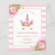 Este doce convite de aniversário apresenta um rosto de unicórnio fofo com buzinas brilhantes cor-de-rosa e lascas falsas de ouro em repouso. Você pode personalizar o nome da aniversariante e o número do aniversário, que aparece em letra rosa de letra rosa. Por trás do falso quadro retangular dourado está um fundo de listras rosa e brancas. Buquês florais cor-de-água rosa decoram dois dos cantos. Os mesmos buquês são exibidos na parte traseira da placa em um plano de fundo correspondente de rosa sólido. O convite ideal para a festa de aniversário de um unicórnio feminino. Consulte nossas coleções para obter suprimentos de unicórnios.