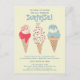 Novo para o Verão de 2024. Nosso cartão-postal de convite "Sorvete, Gritar Que Todos Nós Gritares Surpresa!". Três cones retrorados de sorvete de aquarela com sorvete vermelho, branco e azul patriótico e aspersores ocupam o palco central acima de seus detalhes de festa de aniversário.