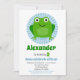 O convite de aniversário deste rapaz apresenta um sapo verde engraçado com grandes olhos num fundo espiral azul.