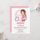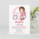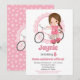 O convite para o aniversário desta garota mostra uma garota marrom e cabeleira com sua bicicleta rosa. Em um fundo de sotaque giro cor-de-rosa e branco com pontos e garota atrás.