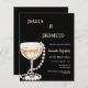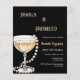Um convite moderno, elegante e sofisticado para uma festa de aniversário Pérolas e Prosecco (qualquer idade) Um fundo preto com um copo em estilo art déco com bolhas e pérolas. O nome é escrito com um estilo de letra manuscrita moderna. Personalize e adicione os detalhes da sua festa.