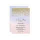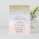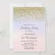 O convite de aniversário com brilho dourado parece design, cor-de-rosa-ombre e fundo azul-d'água.