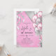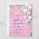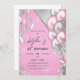 Convite de Aniversário Rosa e Prata com balões e fitas cintilantes e brilhantes.