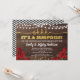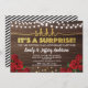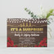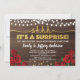 Convite de festa surpresa elegante com rosa vermelha e dourado, com desenho de luzes de corda em fundo de madeira rústica. Sofisticado, feminino e glamoroso.