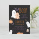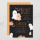 Convite de aniversário temático de Halloween em preto, laranja e roxo. Com fantasmas fofos, morcegos, abóbora e tipografia de estilo divertido. Personalizado com nome, idade e detalhes da festa.