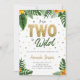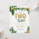 Convite de 2º aniversário em estilo tropical, com folhas tropicais e flores amarelas para crianças que nasceram para ser selvagens.