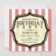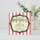 Um circo vintage inspirou um convite de aniversário com um fundo de riscas vermelhas e brancas desbotadas na frente e no verso. a frente apresenta o quadro decorativo do suporte do ouro esboçado em preto. Personalize com detalhes da sua ocasião. com