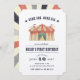 Vamos, vamos todos! Convide convidados para comemorar o aniversário do seu filho com este convite de aniversário de tenda de circo do estilo vintage. Off white card apresenta uma ilustração de tenda de circo com aquarela, com letra de reprodução vintage e um backer com padrão colorido.