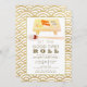 Este convite de Ano Novo chic e moderno "Deixe os bons momentos rolarem" apresenta sushi pintado à mão em uma tábua de madeira com pauzinhos emoldurados por um fundo branco com padrões de ondas em dourado falso. O verso apresenta padrões de ondas em dourado falso. Altere a cor do fundo na frente e no verso e personalize-o de acordo com as suas necessidades.