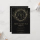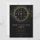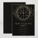 Convite de festa de Ano Novo elegante em preto e dourado. O design apresenta um relógio elegante em dourado que é rodeado por luzes cintilantes douradas e confetes. Convide amigos e familiares para uma festa de feriado moderna com este convite de Ano Novo que pode ser personalizado com a inclusão dos detalhes da sua festa.