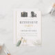 Design moderno em ouro e neutro com detalhe de champanhe derramado, sotaques de mala de viagem e poltrona, e toques botânicos suaves em um fundo texturizado. A tipografia serif limpa equilibra o layout, adequada para reuniões de festa de aposentadoria e celebrações noturnas sofisticadas.