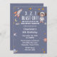 Aproxime-se de uma aventura cósmica com o Convite de aniversário Espacial das Crianças do tema Astronauta! Com designs de astronautas, foguetes e planetas, este convite irá transportar o seu pequeno e os seus amigos para uma galáxia de diversão. Perfeito para entusiastas do espaço, é a maneira ideal de começar a festa! Faça do aniversário do seu filho uma experiência fora deste mundo com este convite estelar. Perfeito para qualquer jovem astronauta pronto para uma celebração espacial tática! Este convite faz parte de uma coleção de festas de aniversário com itens de coordenação disponíveis. Nós o encorajamos a explorar o conjunto de cheios para criar uma celebração de partido perfeitamente igualada.