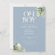 Convite de baby shower menino com tipografia elegante e folhagem botânica verde bonita em um fundo azul desbotado e seu código QR no verso. Criado por Thisisnotme©