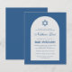 Um convite de bar mitzvah econômico. Sobre um fundo azul clássico, tem um arco branco com texto azul dentro. O nome é escrito em uma fonte caligráfica elegante. Acima do texto há uma estrela de Davi azul.