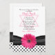 Convite de Bat Mitzvah feminino e sofisticado, com bolinhas pretas e brancas, fita e gerbera rosa, e Estrela de Davi judaica.