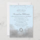 Um convite elegante de Bat Mitzvah, azul e prateado, com um confete de brilho prateado no topo e um brilho prateado no fundo com uma estrela reluzente de David.