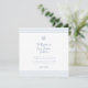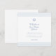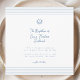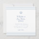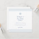 Um convite de batismo quadrado clássico, mas moderno, em azul branco, apresentando listras sutis na parte superior e inferior, uma concha pintada à mão com uma cruz e uma fonte de letra cursiva suave para um visual elegante e significativo.