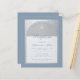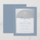 Um convite de batismo moderno. Em um fundo retangular, tem um arco de folha de prata falsa que contém texto azul poeira em fundo branco. A palavra Batismo e o nome são escritos em uma fonte caligráfica elegante; a primeira linha é texto arqueado.