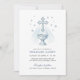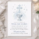 Este belo convite de batismo apresenta um design sereno em aquarela azul com uma cruz proeminente e uma fonte, rodeada por estrelas suaves. Os tons azuis suaves e detalhes delicados criam uma atmosfera pacífica e espiritual, perfeita para celebrar o dia especial do seu filho. É ideal para anunciar o batismo, a cerimônia de batismo ou a cerimônia de nomeação de um bebê menino. A elegante letra para 'Recepção a seguir' adiciona um toque de sofisticação a esta peça comemorativa.