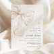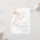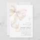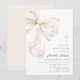 Convite de batismo minimalista que apresenta um elegante laço bege neutro e tipografia elegante.