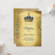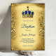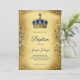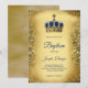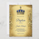 Convite de batismo dourado com um design ornamentado, apresentando uma coroa azul no topo. O texto com letra elegante transmite um tom formal e comemorativo.