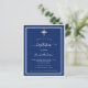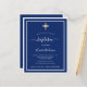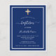 Um convite moderno e elegante. Um fundo azul marinho decorado com molduras brancas e uma cruz dourada. Personalize e adicione um nome e detalhes. Texto branco.