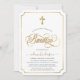 Moderno convite de Batismo elegante com fundo branco, cruz dourada elegante, tipografia Batismo em letras douradas da moda. Para editar este modelo, clique em personalizar ainda mais.