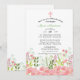 Flores silvestres suaves em tons de rosa e verde acentuam a parte inferior do convite. Adornado com uma cruz rosa e branca.