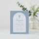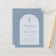 Um convite de batismo moderno. Em um fundo azul poeirento, tem um arco branco com texto azul poeirento dentro. A palavra Batismo e o nome são escritos em uma fonte caligráfica elegante; a primeira linha é um texto arqueado.