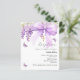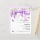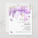 Um fundo branco elegante, decorado com uma grande lavanda, laço roxo, flores de glicínias, borboletas e uma cruz dourada. Personalize e adicione um nome e detalhes da festa.