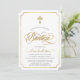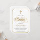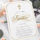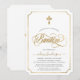 Convite de Bautizo moderno e elegante com fundo branco, cruz dourada elegante, tipografia Batismo em letras douradas da moda. Para editar este modelo, clique em personalizar ainda mais.