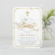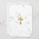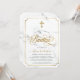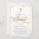 Convite de Bautizo moderno e elegante com fundo de mármore branco, cruz dourada elegante, tipografia de Batismo em letras douradas da moda. Para editar este modelo, clique em personalizar ainda mais.