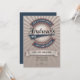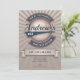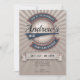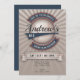 Convite de beisebol apresenta uma ilustração de beisebol em estilo vintage, personalizada com nome, sublinhado por um rabisco. Este design inclui elementos de azul, vermelho, um beisebol, faixas e um fundo de explosão de estrelas. Modelo para personalização pessoal, incluindo idade ou número do jogador.